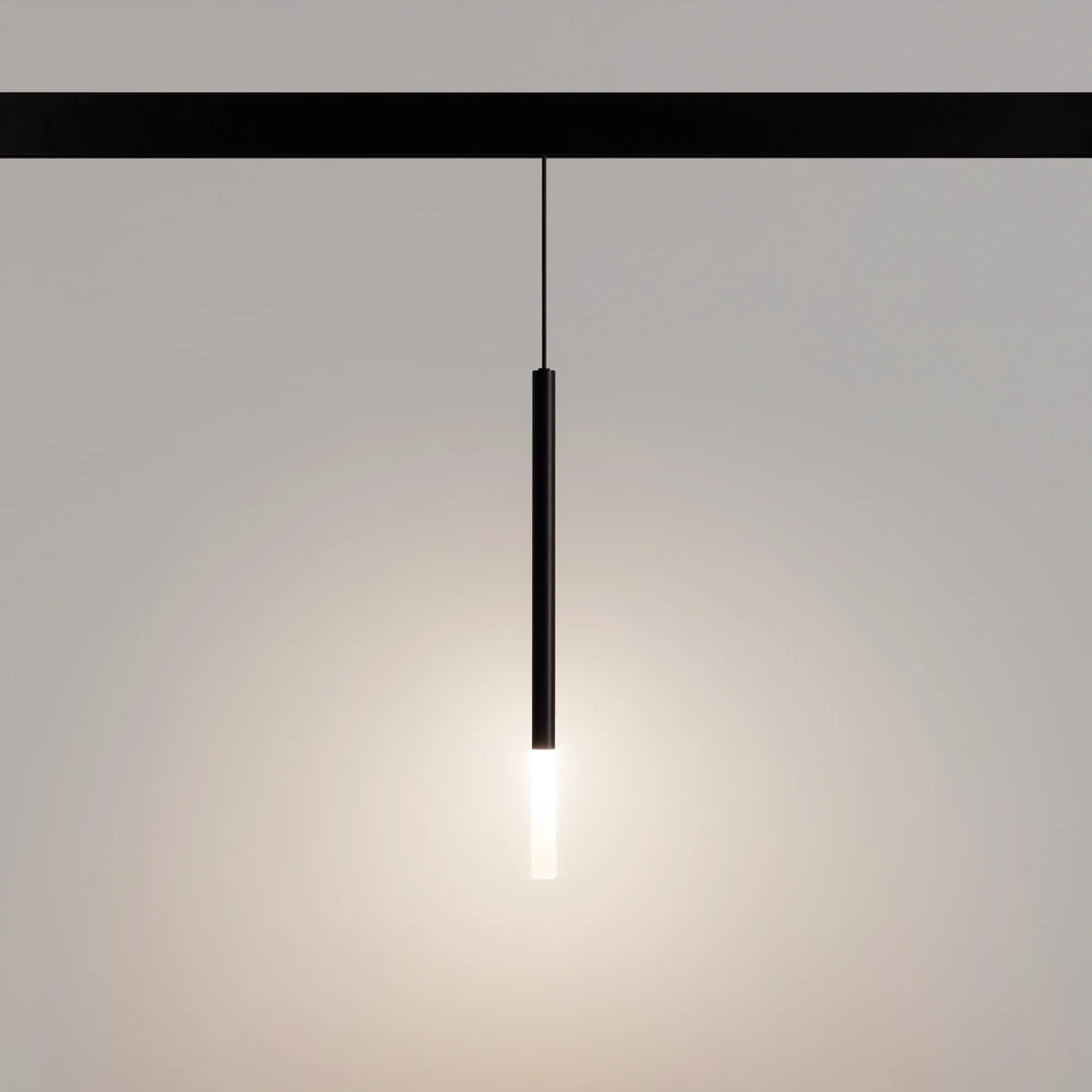 Светильник для магнитных треков MAG-ORIENT шириной 26 мм. Мощность 3 Вт, св. поток 120 лм, теплый 3000 K, CRI>90, угол 180°, напряжение питания 48 В. Черный цилиндрический корпус из металл, степень защиты IP20. Размер: длина светоизлучающего модуля 120 мм, длина светильника 450 мм ширина 20 мм, высота с учетом подвеса 2000 мм. Монтаж на трек MAG-ORIENT. Пульсация <1%. UGR<16. Подвес регулируется.