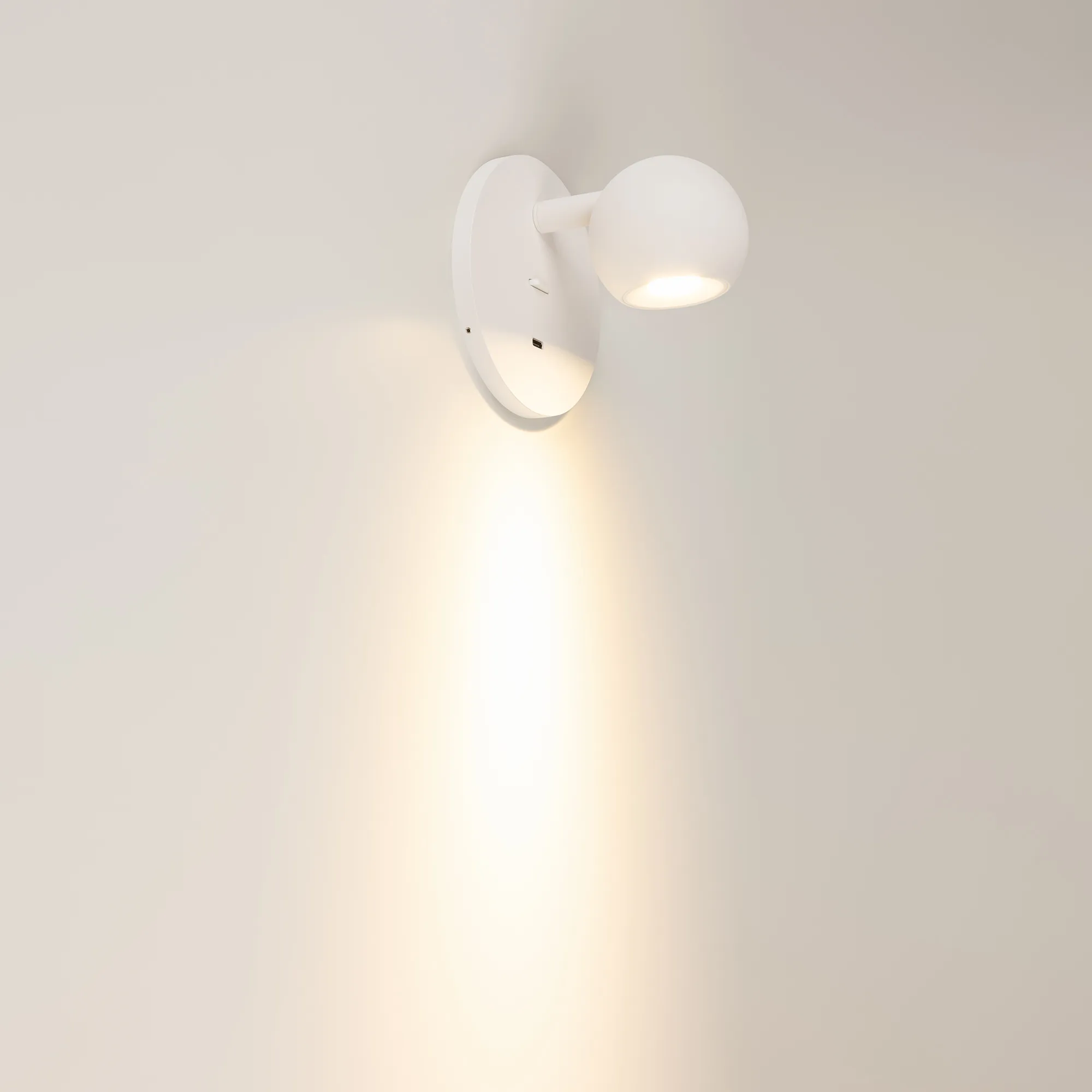Встраиваемый настенный светильник. Мощность 6 Вт, св. поток 580 лм, 100 лм/Вт, теплый 3000 K, CRI>90, угол 30°, напряжение питания 230 В. Белый круглый корпус из алюминия, степень защиты IP20. Габариты: Ø110х103 мм, размер основания Ø110х8 мм, размер светового модуля Ø65×55,5 мм. IP20. Встроенный USB порт для зарядки (TYPE-C). Выключатель на корпусе.